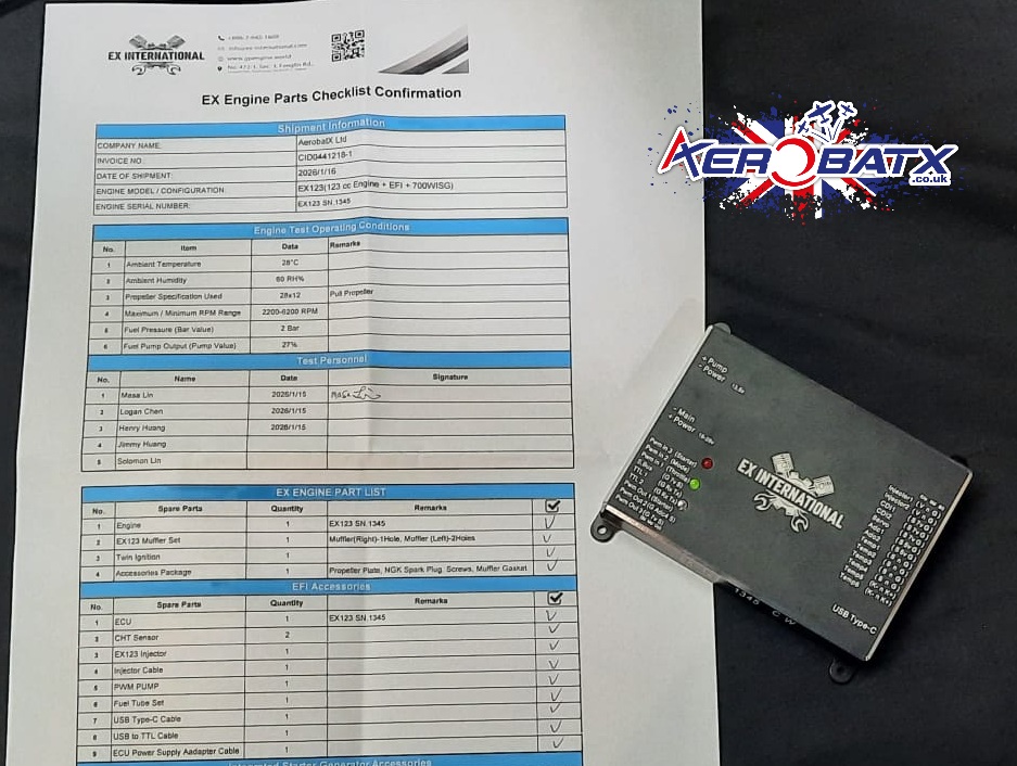 Cheltenham, UK — AerobatX, a trusted provider of high-performance commercial and industrial UAV engine solutions, has successfully delivered another batch of its advanced EX123 (123cc, 2-stroke) UAV engines. The engines were supplied complete with electronic fuel injection (EFI) systems and customised 24V starter-generator units, meeting stringent technical and operational requirements.